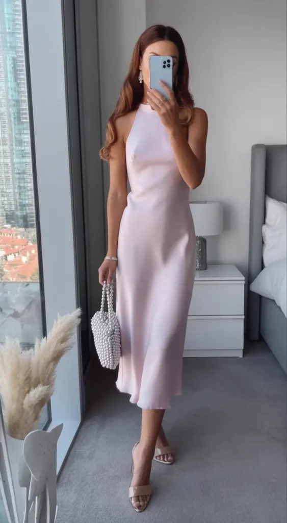 Blush satin looks smooth and elegant, especially in spring light. The simple shape makes it feel classy without needing a lot of styling.