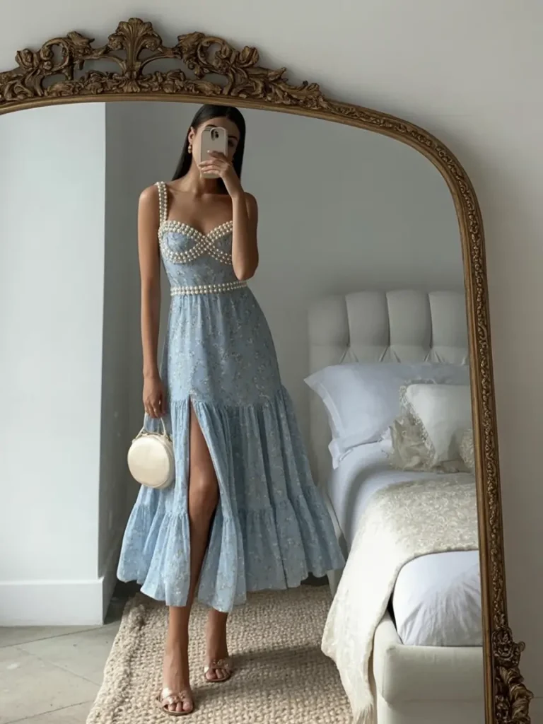 2. Soft blue glamour with pearl details and a graceful slit
