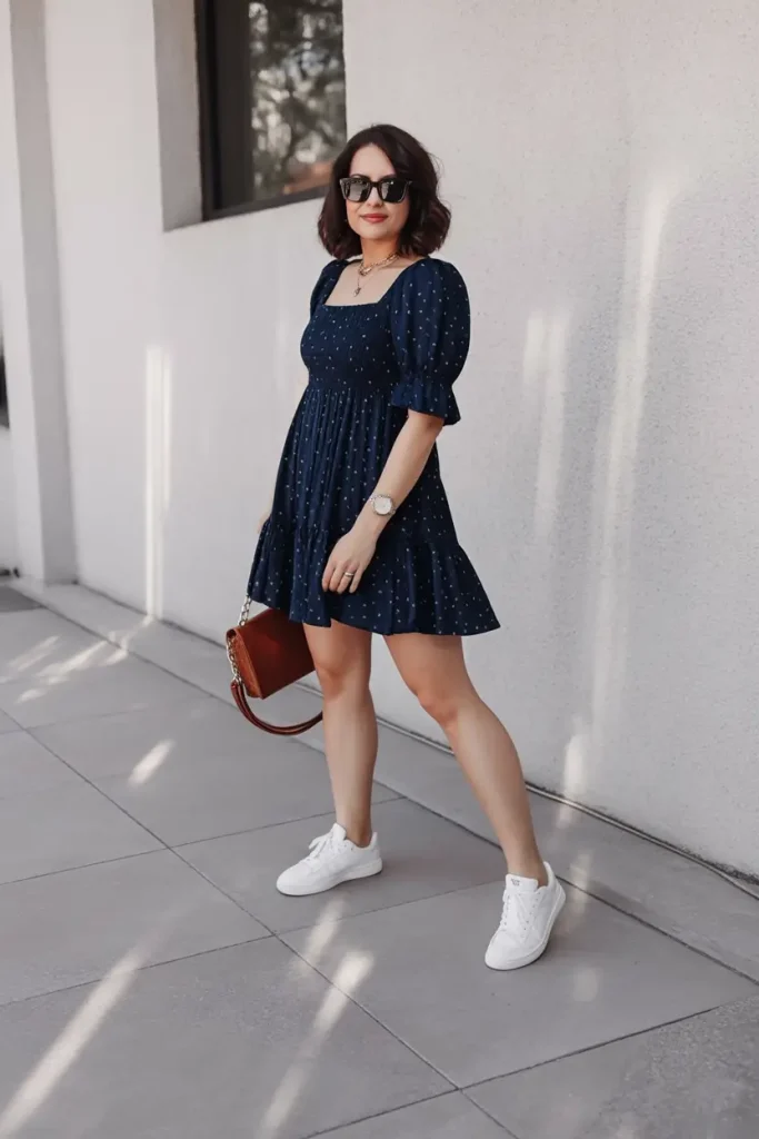 21. Navy puff sleeve mini with white sneakers for everyday spring ease
