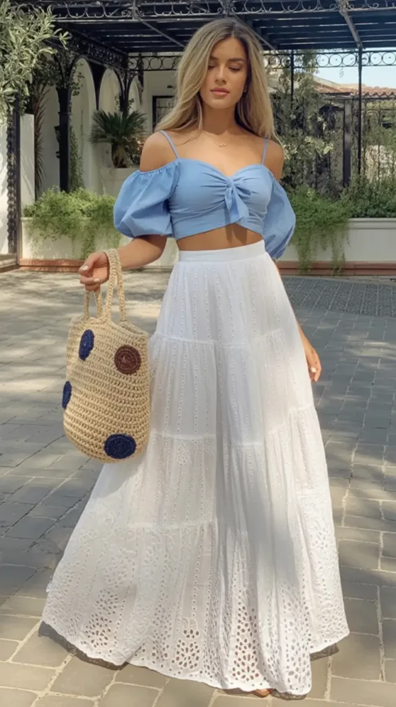 7. Playful blue crop top and airy white eyelet skirt with warm weather energy