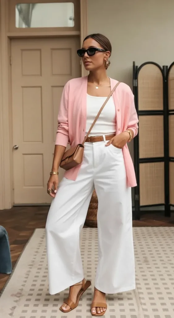 A blush cardigan with white pants feels feminine and friendly. It’s a soft look that still feels clean and neat for spring.