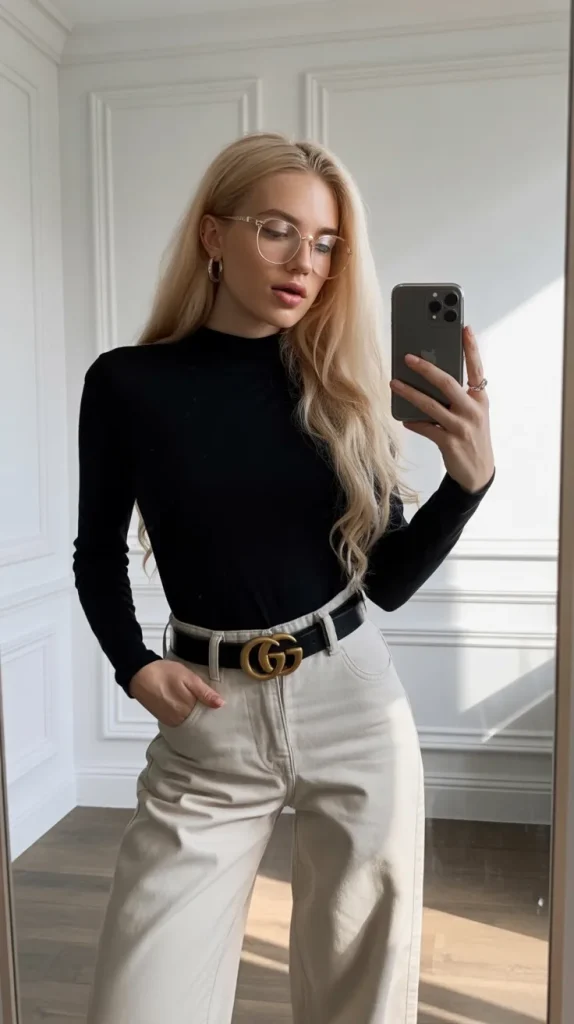 A fitted black top with neutral denim is a simple classic. It feels confident, timeless, and easy to wear when you don’t have much energy to plan.