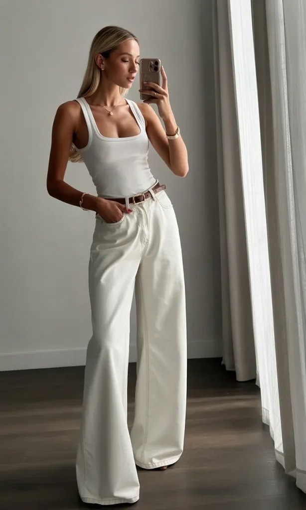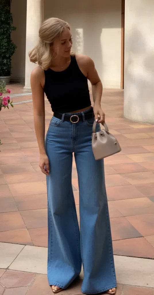 This look feels clean and feminine without trying too hard. The black tank keeps it simple, and wide-leg jeans make it comfortable and flattering.