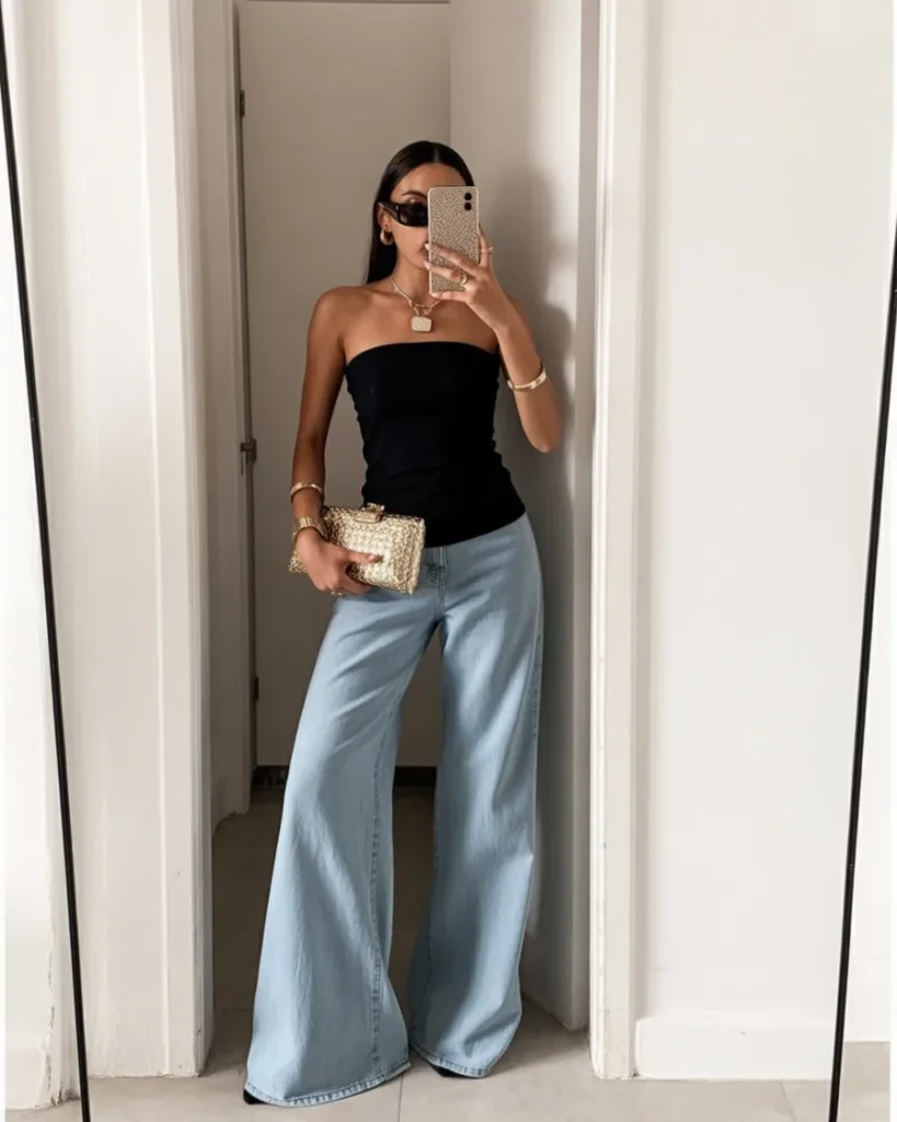 This outfit feels sleek and confident without being complicated. The strapless black top is simple, and the wide-leg denim adds movement and comfort.