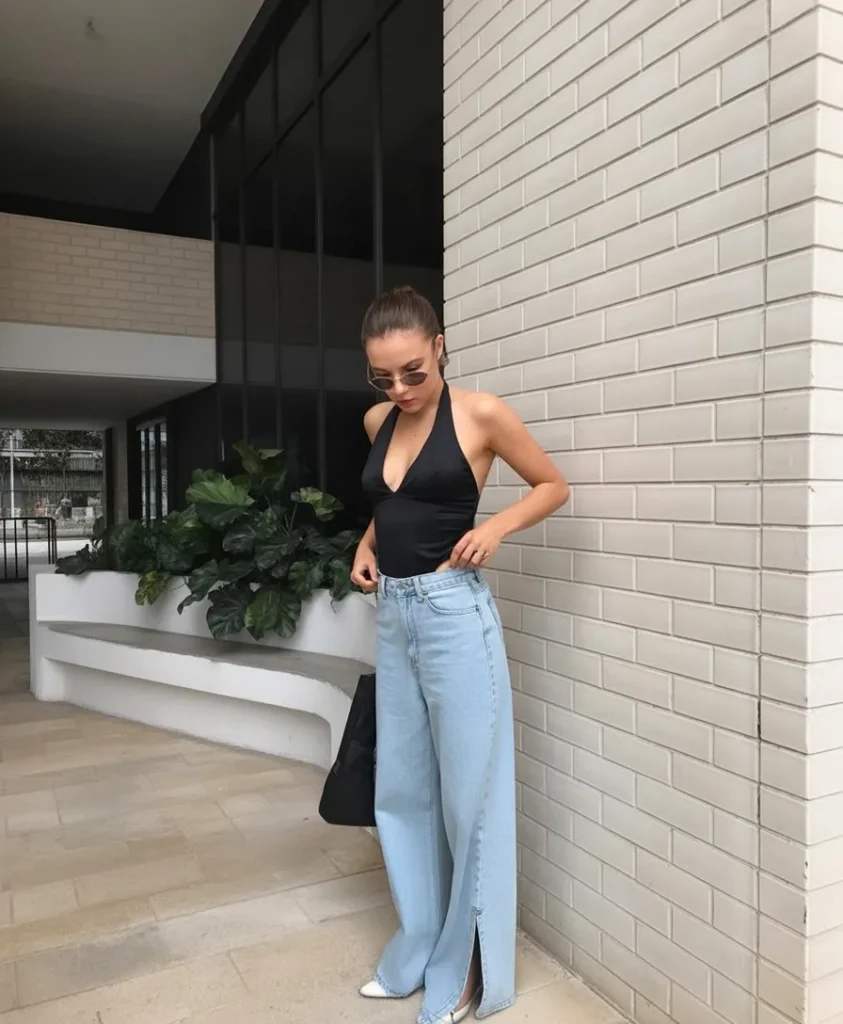 A black halter top adds a fun, modern touch, while light denim keeps the outfit grounded. It’s a nice mix of bold and casual.