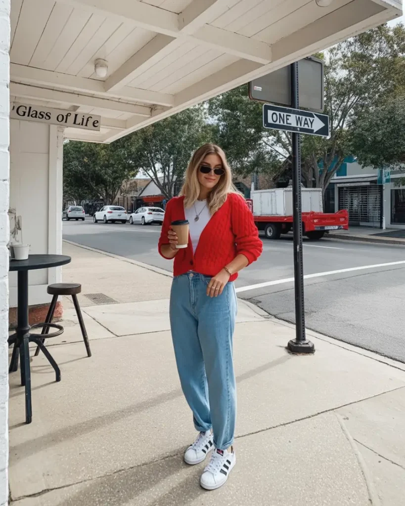 A red blazer is bold, but it’s still easy to style. Keep the rest neutral—black trousers and white sneakers help the color stand out in a clean way.