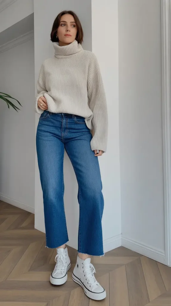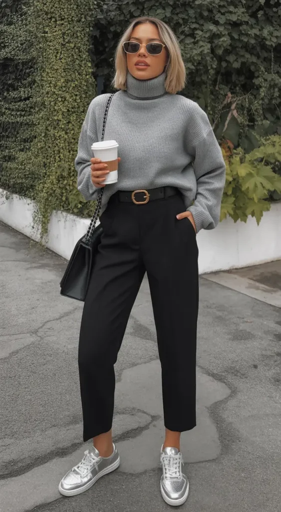 A cozy turtleneck is a lifesaver when mornings still feel like winter. Cropped trousers keep the look lighter, and metallic sneakers add fun.