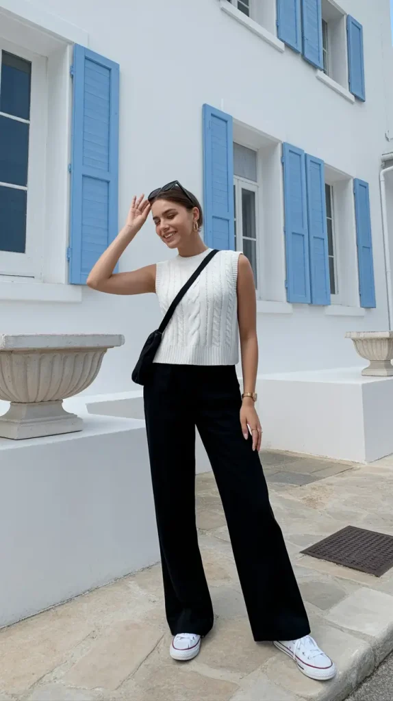 A sleeveless cable knit adds warmth without heavy sleeves, which is perfect for in-between weather. Wide-leg trousers make the outfit look long and polished.