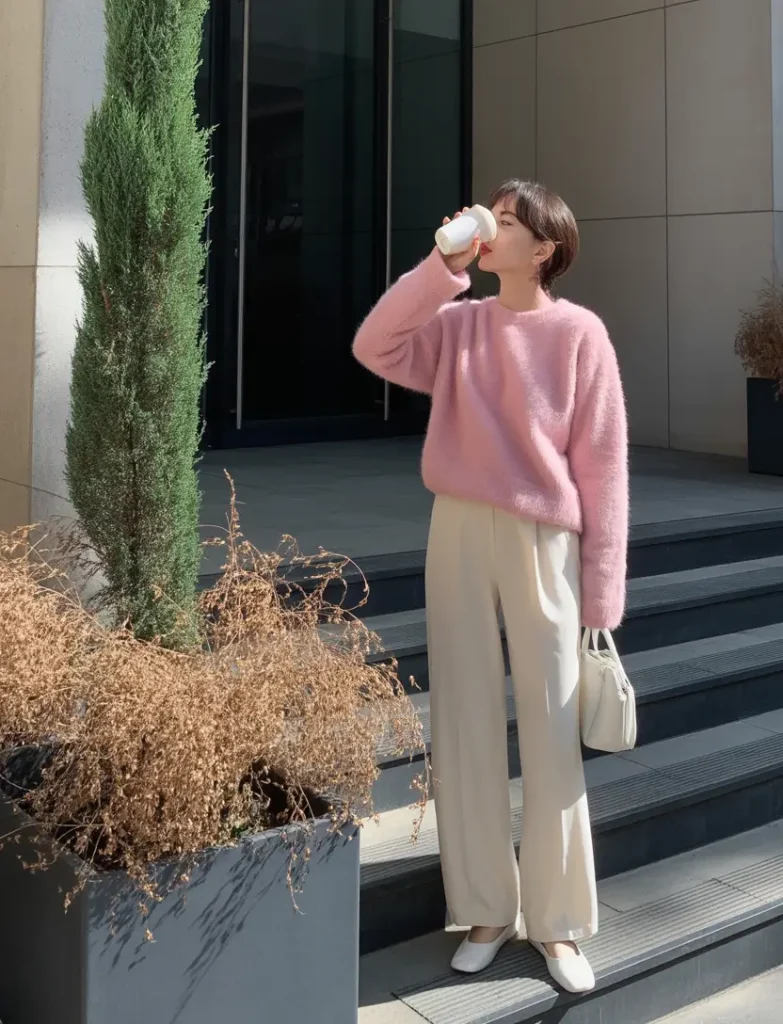 A fluffy pastel sweater looks soft and fresh against cream trousers. It’s calm, light, and still warm enough for breezy afternoons.