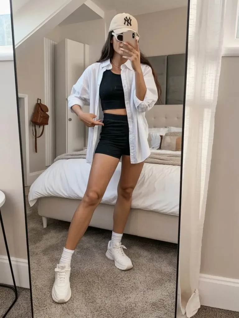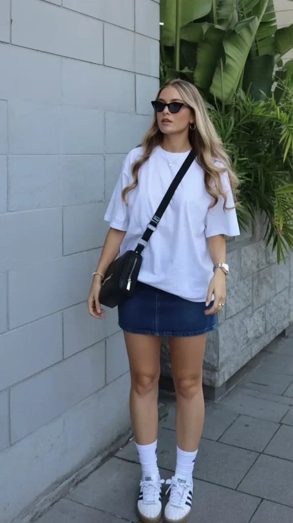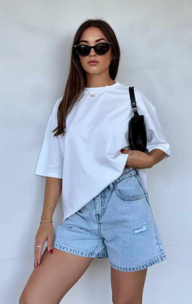 An oversized white tee with relaxed denim shorts is simple, cool, and always in style. It’s the kind of outfit that never feels “wrong.”
