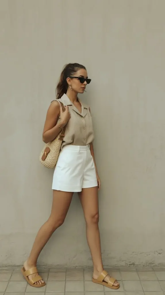 A sleeveless linen button-up with structured white shorts feels airy and “quietly stylish.” It’s simple, but it looks expensive because the fabric does the work.