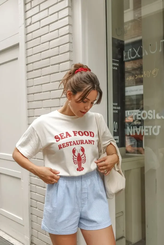 6. Playful Graphic Tee And Striped Shorts Easy Weekend Mood