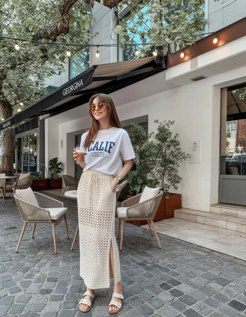 A plain white tee tucked into a knit skirt feels soft and a little romantic. It’s the kind of look that works for coffee dates or slow afternoons.