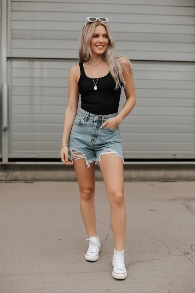 Some days you just want to feel free. A tank-style black bodysuit with distressed denim shorts is the most relaxed and reliable casual summer bodysuit outfit you can build. It is practical, breathable, and still manages to look pulled together with zero stress.