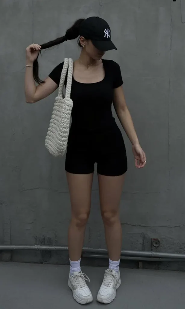 This look strips everything back in the best possible way. A fitted black bodysuit with a biker short silhouette creates a clean, athletic line that feels both strong and effortless at the same time.