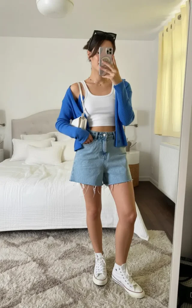 A white tank with denim shorts is a classic. Adding a soft cardigan makes it feel complete and helps when mornings are cooler or places blast the AC.