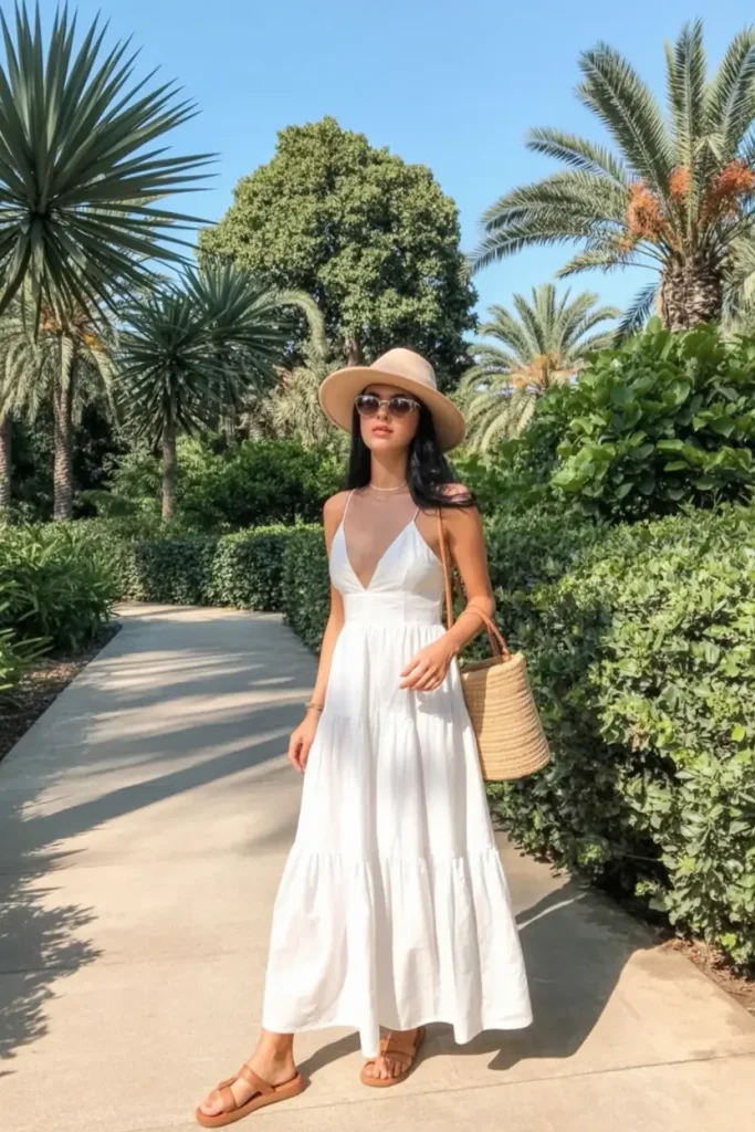 A lightweight white dress with sandals, a straw bag, and a wide-brim hat is an instant outfit. It feels airy, pretty, and timeless.