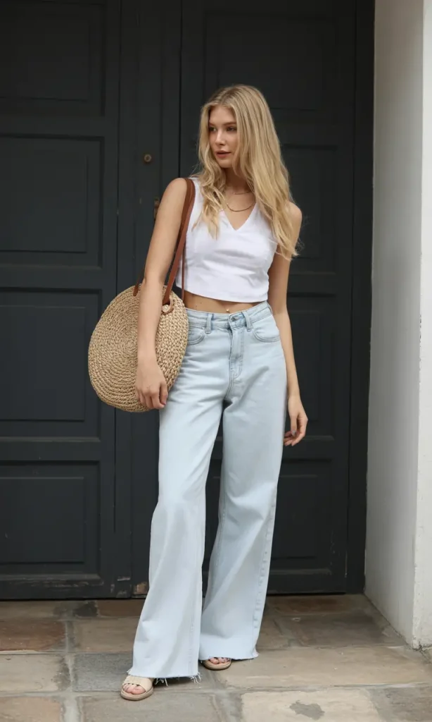 A fitted white top with wide-leg light denim looks more elevated than basic shorts. A woven bag adds texture and warmth without trying too hard.