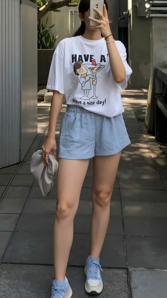 A graphic tee with soft striped shorts is relaxed and fun. Sneakers keep it practical for walking, errands, or casual meetups.