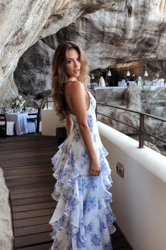 A blue layered floral maxi dress feels romantic and a little dressy. The layers create movement and make the outfit feel more special. It has a graceful look that is perfect for dinners, celebrations, or memorable summer evenings.