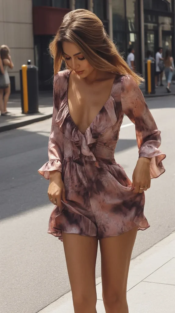 This sheer ruffle mini dress in brown tones feels soft, airy, and feminine. The flowing fabric gives it a dreamy look, and the ruffles add a gentle touch of movement. It is stylish in a very light and effortless way.