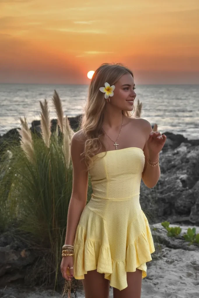 This butter yellow strapless mini dress looks soft, cheerful, and full of sunshine. The light color gives it a fresh and youthful feel, while the strapless cut makes it perfect for hot summer weather. It feels sweet and eye-catching at the same time.