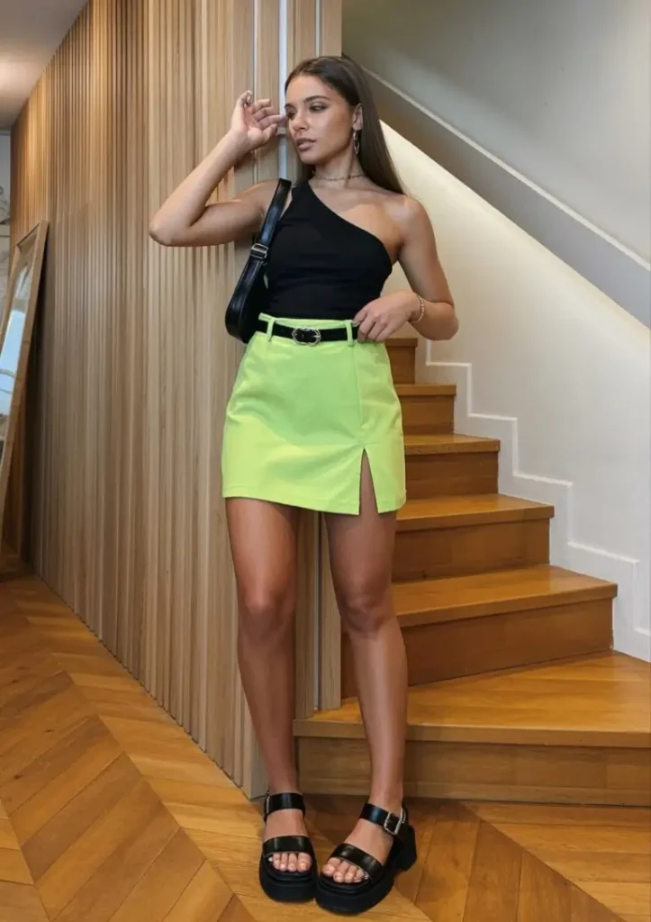 A vibrant mini skirt with a fitted black top creates bold contrast that stands out without being too loud. The sharp color draws attention, and the simple top keeps everything balanced.