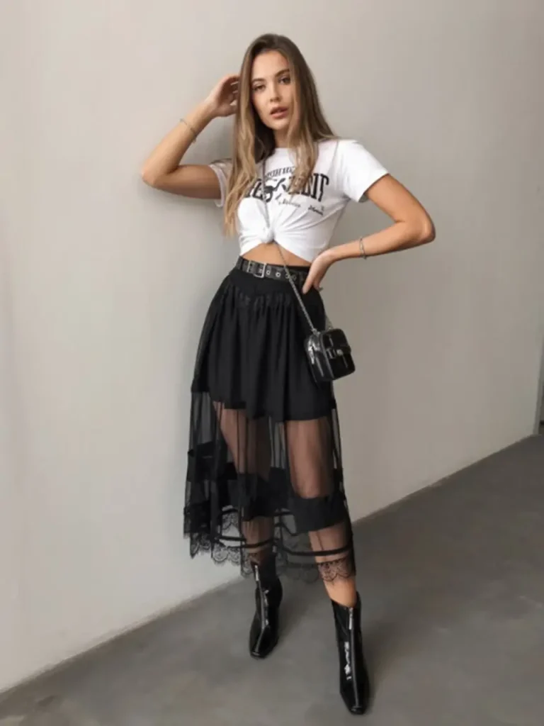A graphic tee with a sheer layered skirt feels creative and slightly rebellious. The structured tee keeps things grounded, and the transparent skirt adds movement and depth.
