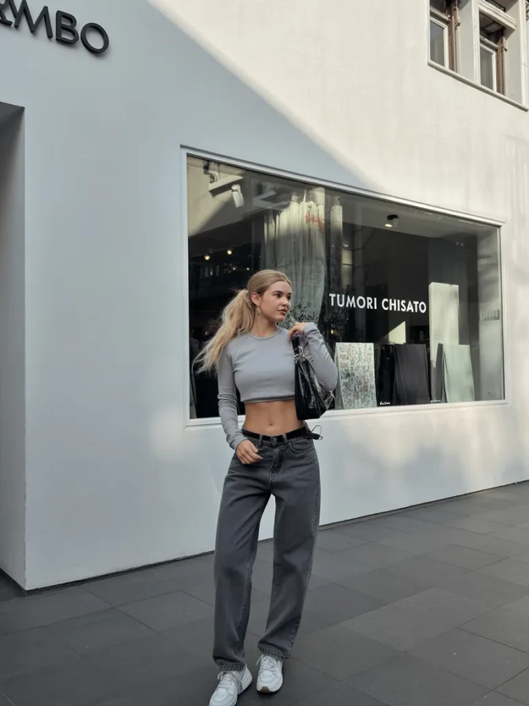 This is a clean, low-effort outfit that still looks good. A minimal long sleeve top with relaxed jeans gives you a polished “off-duty” vibe.