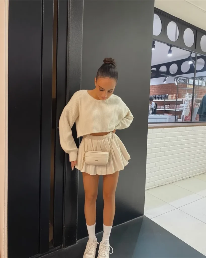 If mornings are cooler or classrooms are air-conditioned, this combo is a smart choice. A soft cropped sweater paired with a flowy skirt balances comfort and style.
