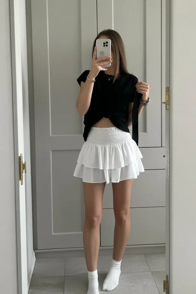 This outfit is all about contrast—simple top, fun skirt. The black tee keeps it relaxed, while the white ruffle skirt adds a feminine touch.