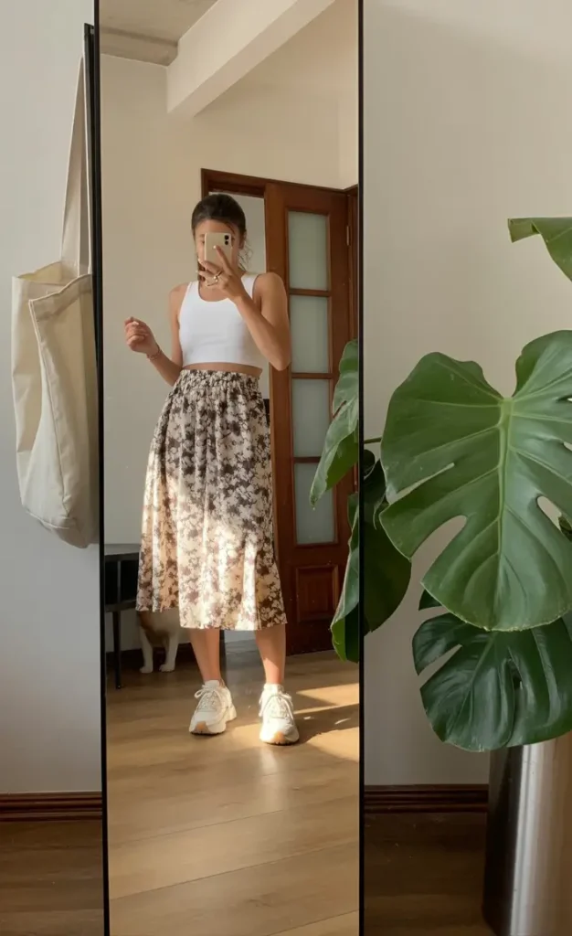 A flowy midi skirt in a soft beige or brown print looks very feminine, but it doesn’t feel too “dressy” when you add white sneakers. A cropped tank keeps the outfit light and breathable for hot days.