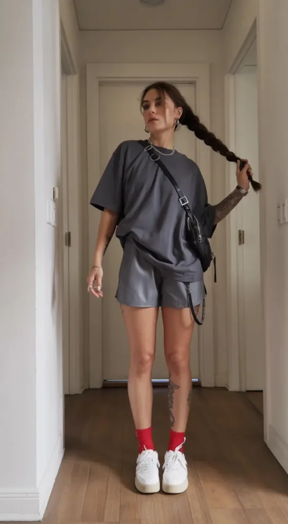 A dark oversized tee with relaxed shorts creates a cool monochrome base. Then red socks add an unexpected detail that stands out.