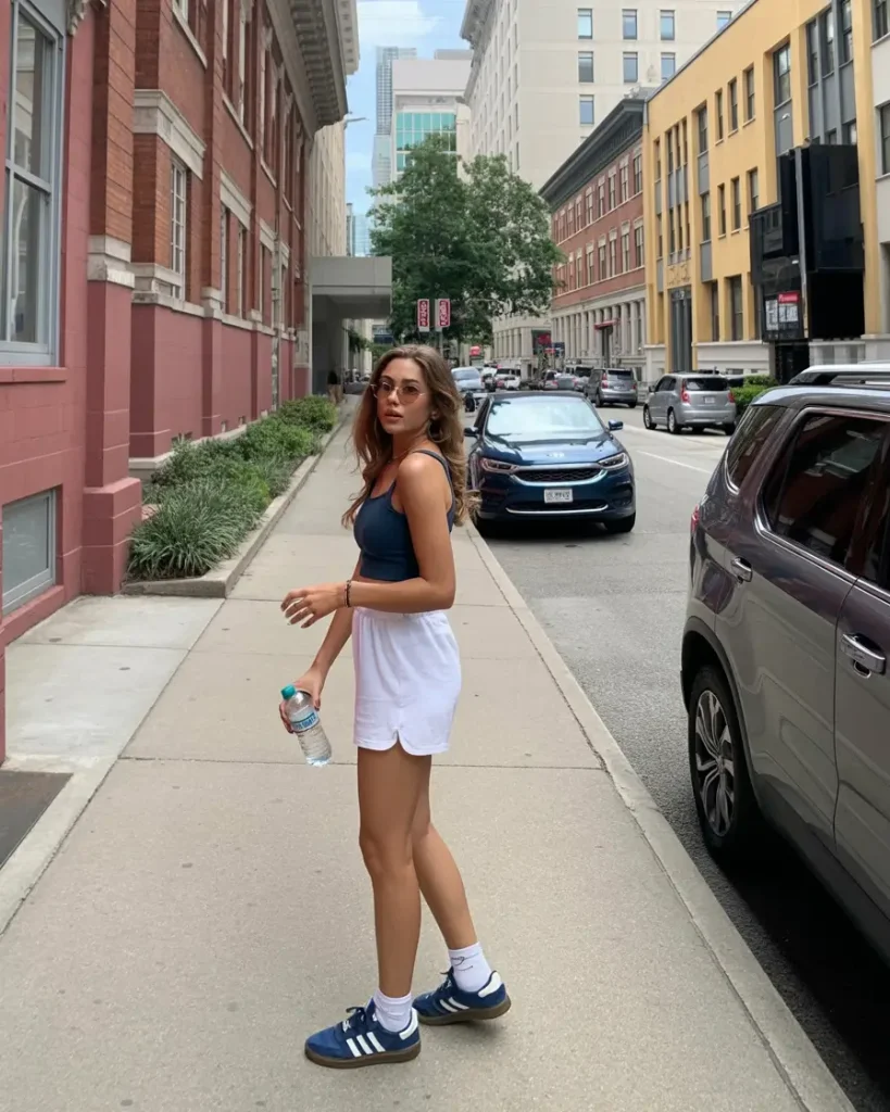 A fitted navy tank with airy white shorts looks clean and sporty. It’s a strong combo when you want to move around all day.