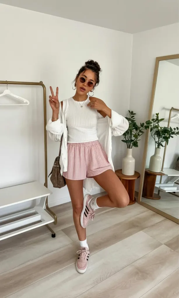 Pink striped shorts feel playful and soft. Pair them with a fitted white top, then add a light white shirt on top for an airy layered look.