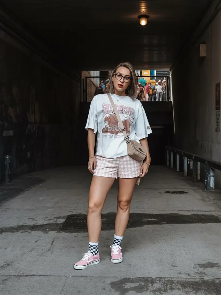 A loose graphic tee brings personality fast, especially with pink shorts. The slightly oversized shape feels modern and comfortable.