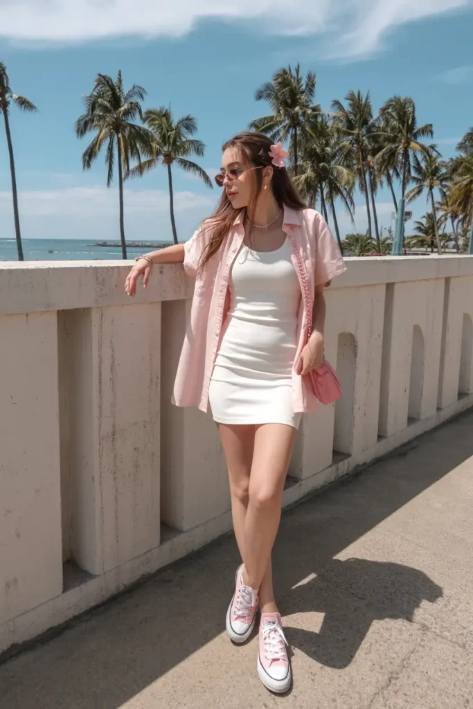 A fitted white mini dress looks fresh on its own, but an oversized pink shirt on top adds a relaxed vacation feel. It also helps you feel more covered without getting too warm.