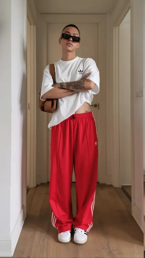 Red track pants make a big statement, so keep the rest simple with a white tee. The contrast looks bold but still easy to wear.