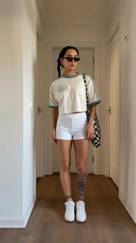 A cropped tee with green details and fitted shorts feels sporty and sharp. It looks athletic, but it can still work for everyday plans.