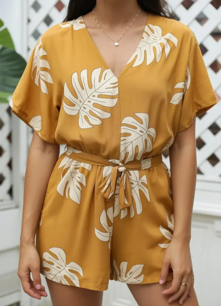 A golden romper with tropical prints feels bright and fun. It’s the kind of piece that makes your whole outfit look happy with almost no effort.