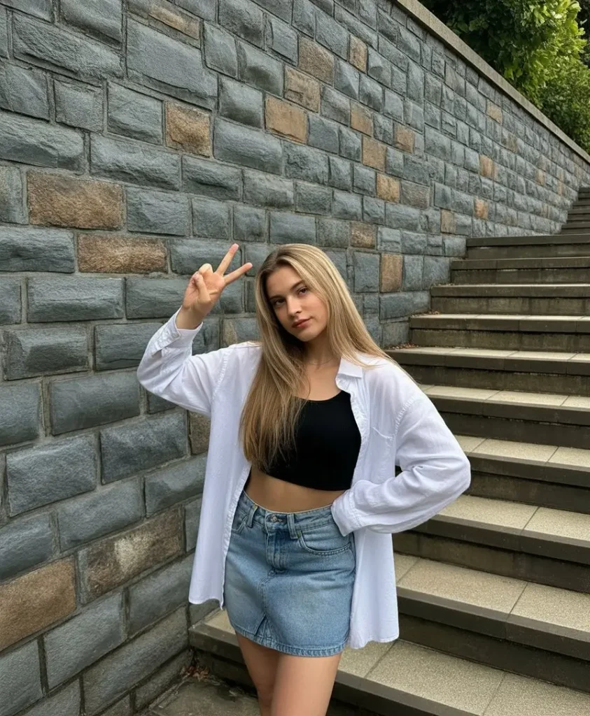 A black crop top with a light denim mini is a strong basic. Throwing an oversized white shirt on top makes it feel relaxed and gives a little coverage.