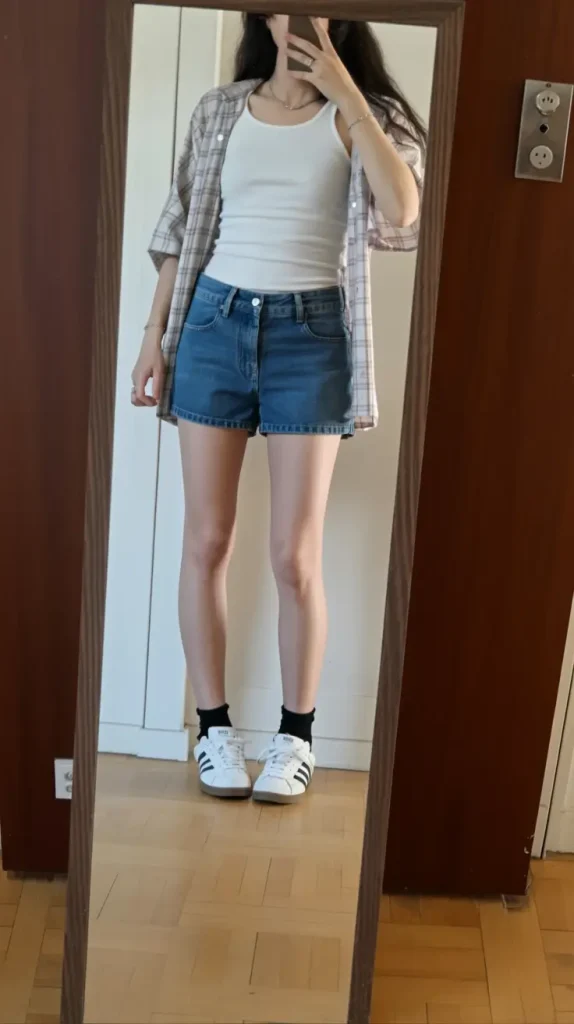Start with a white tank and denim shorts, then layer an open plaid shirt. It’s a classic look that always feels “done” without being heavy.