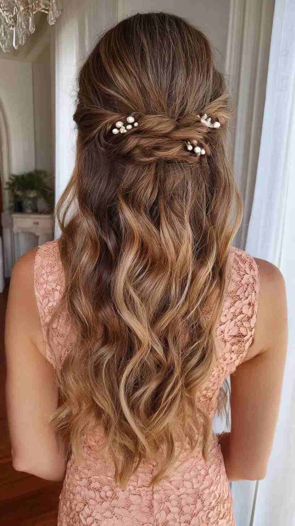 If your dress is strapless or sweetheart, soft waves or a half-up style can balance the look. This adds shape around your face without hiding your shoulders. It also looks flattering in photos from every angle.