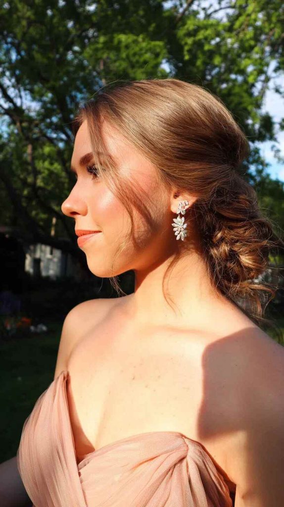 For one-shoulder or off-the-shoulder dresses, try side-swept hair or a soft updo with a few pieces around the face. This matches the shape of the dress and looks natural in photos. Keep the front pieces light so they don’t fall into your eyes.